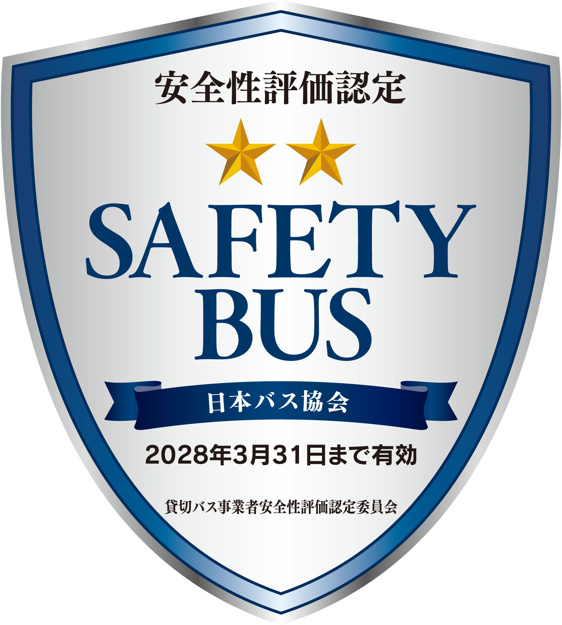 2025年12月23日付けで、公益財団法人 日本バス協会貸切バス事業者安全性評価認定制度にて、 弊社は【二ツ星】を達成いたしました。 この評価にふさわしい安心・安全な運行を継続して心がけてまいりますので、今後ともよろしくお願いいたします。