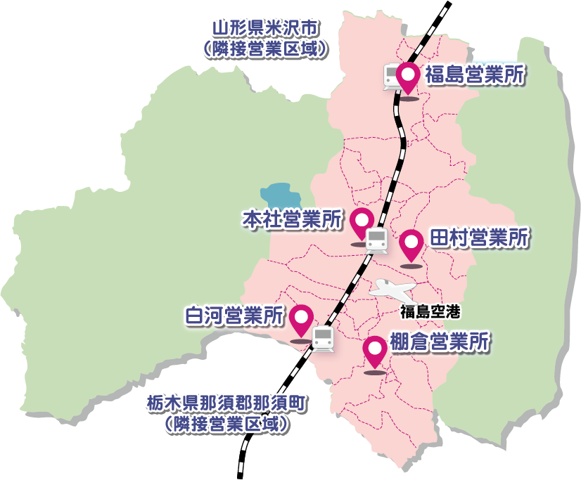 弊社は福島県・山形県米沢市・栃木県那須町を営業区域としています。 新幹線最寄り駅の5km以内にあり、福島空港とも近いです。